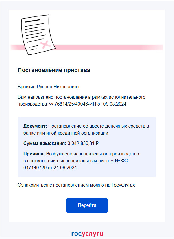 | Нарушены права Конституционные России - Руслана Бровкина.   Коррумпированный верховный суд России и коррумпированные приставы. Незаконно наложили постановление о взыскании в рамках исполнительного производства № 76814/25/40046-ИП от 09.08.2024 с Руслана Бровкина суммы в размере: 3.02.830,31 рублей, а также были не законно наложены аресты банковские платёжные счета и карты Руслана Бровкина. Причина: Возбуждено исполнительное производство в соответствии с исполнительным листом № ФС 047140729 от 21.06.2024